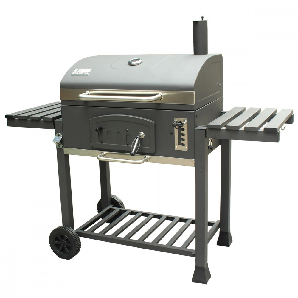 A grillsütő a négy masszív lábnak köszönhetően nagyon stabil, és a két kereke segítségével könnyen mozgatható.