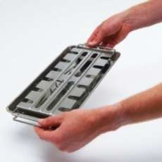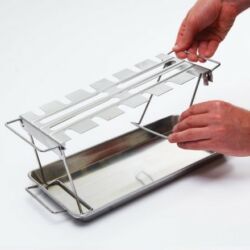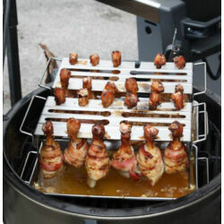 - A Broil King csirkecomb sütő szettje egy rozsdamentes acél tálcával és egy abba pontosan belepasszoló combtartóval érkezik, ami a sütésben és a tálalásban is kitűnő segítőtárs. A tartóba az alsó combon kívül természetesen más csirkerész is felakasztható: szárny, felső comb vagy kisebb csirkedarabok is kerülhetnek bele. A tálca plusz fűszerek, ízesítők tárolására is használható és felfogja a lecsöpögő zsiradékot is, így megakadályozza az étel megégetésével fenyegető lángfelcsapásokat. Az akasztó pedig abban segít, hogy a húsnak ne kelljen érintkeznie a ráccsal, és ezzel megelőzhetővé válnak a nem kívánatos leragadások. A szett mindkét eleme használható külön-külön is.