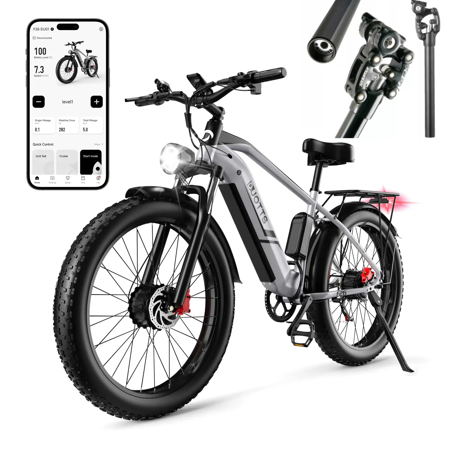 - Maximális sebesség: 55 km/h Az F26 kerékpár képes elérni a 55 km/h-s maximális sebességet, ami rendkívüli teljesítményt nyújt mind városi, mind terepi környezetben.