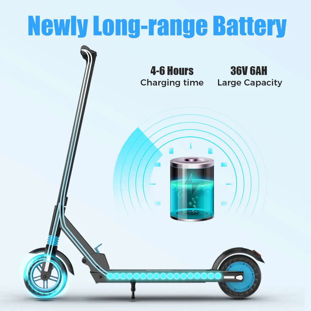 - Hosszú hatótávolság: A beépített 36V 6Ah lítium-ion akkumulátor 20-25 km-es hatótávolságot tesz lehetővé egyetlen töltéssel.