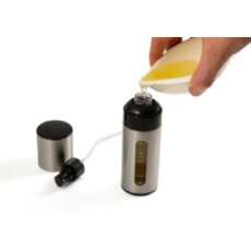 - A fémköpenybe bújtatott műanyag permetező a grillre kerülő húsok, zöldségek egységes olajozására használható elsősorban. Sütés előtt, de közben is alkalmazható, hogy megvédje az alapanyagokat a kiszáradástól, letapadástól. A permetező természetesen nem csak olaj tárolására, adagolására alkalmas, szűrt páclét is lehet bele tenni, így a hús locsolása is megoldható a spray segítségével. A pumpás permetező nem tartalmaz a környezetre káros gázokat, feltöltése és tisztítása is egyszerű. Szinte bármilyen híg állagú folyadékkal együtt használható a szórófej, és a sütésre kész alapanyagok mellett az edények, sütőfelület vagy a rács olajozásához is hasznos. Sokáig azonban nem érdemes benne tartani az olajat, vagy legalább a szórófejet mossa el minden használat után alaposan, mert különben előfordulhat, hogy megavasodik az olaj.