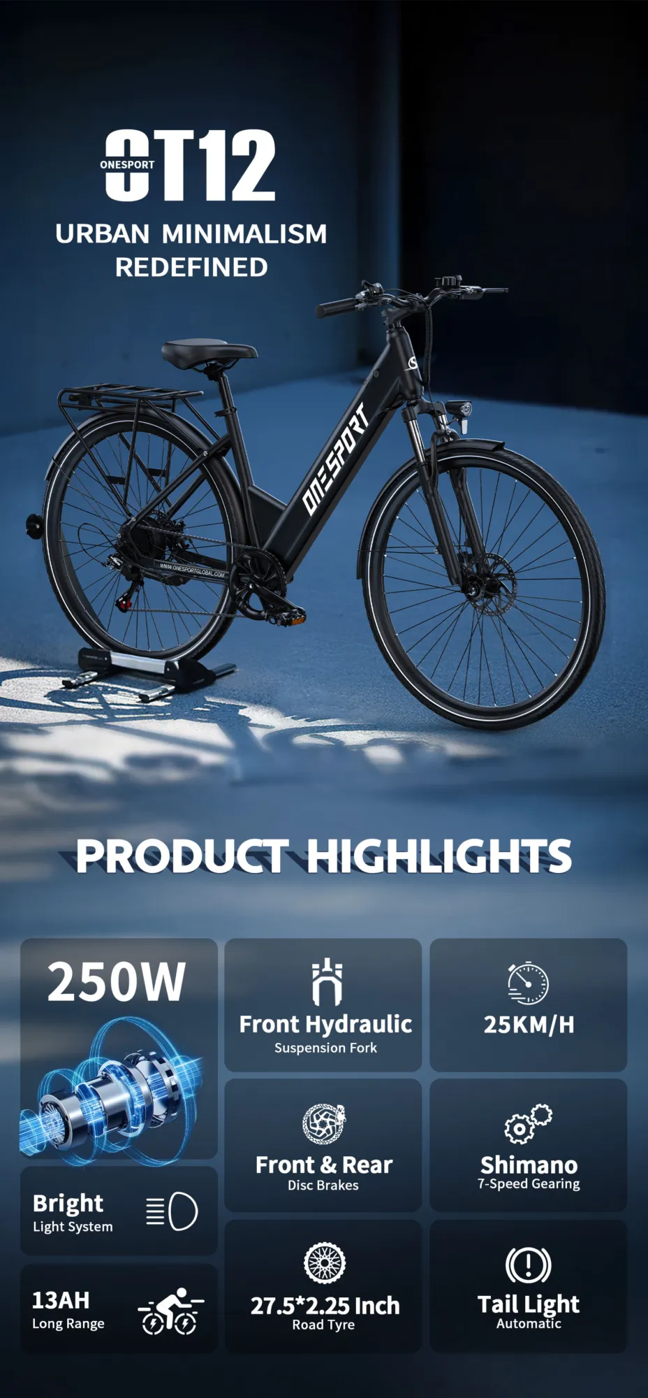 ONESPORT OT12 Elektromos Kerékpár 27,5″ Fekete|Fehér 468Wh