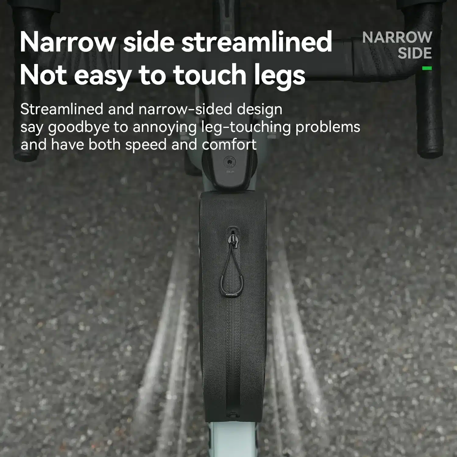 Keskeny, áramvonalas forma: Szorosan illeszkedik a vázhoz, és elkerüli a lábakkal való érintkezést a nyugodtabb, kényelmesebb utazás érdekében.