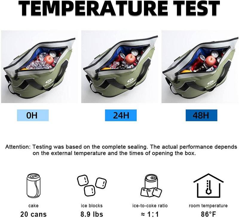 - Kiváló hűtési teljesítmény: akár 48 órán át hűtött. Beltéri tesztelés 30°C-on: a hőmérséklet -3°C-ról 3°C-ra emelkedett 48 óra után. Vastag szigetelőanyagból készült, külső rétege 840D nejlon, belső rétege 420D poliészter. Megjegyzés: Kérjük, ne tegyen bele forró ételt.