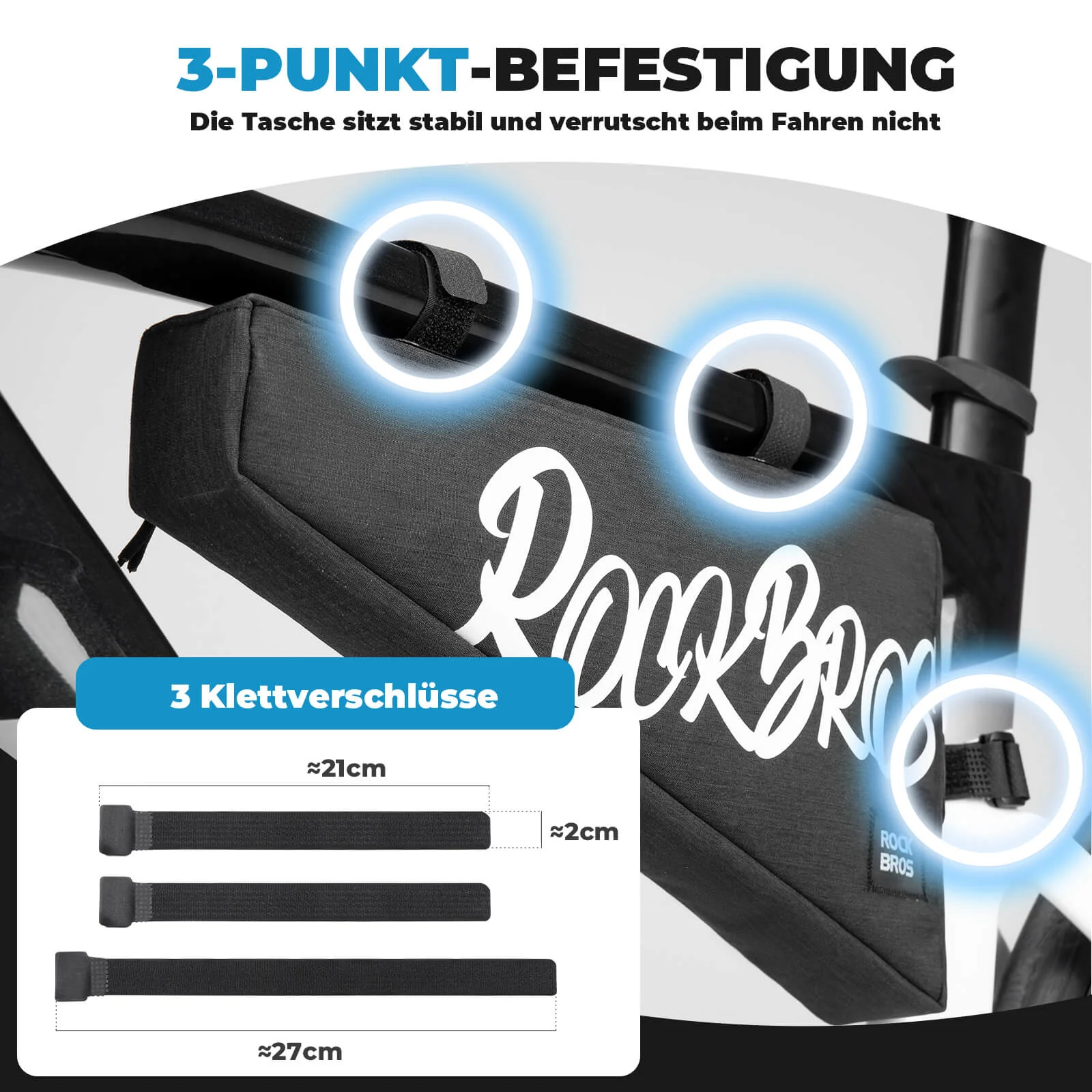 Három robusztus szíj biztonságosan rögzíti a táskát a felsőcsőhöz és a kormánycsőhöz – egyenetlen terepen sem csúszik el.