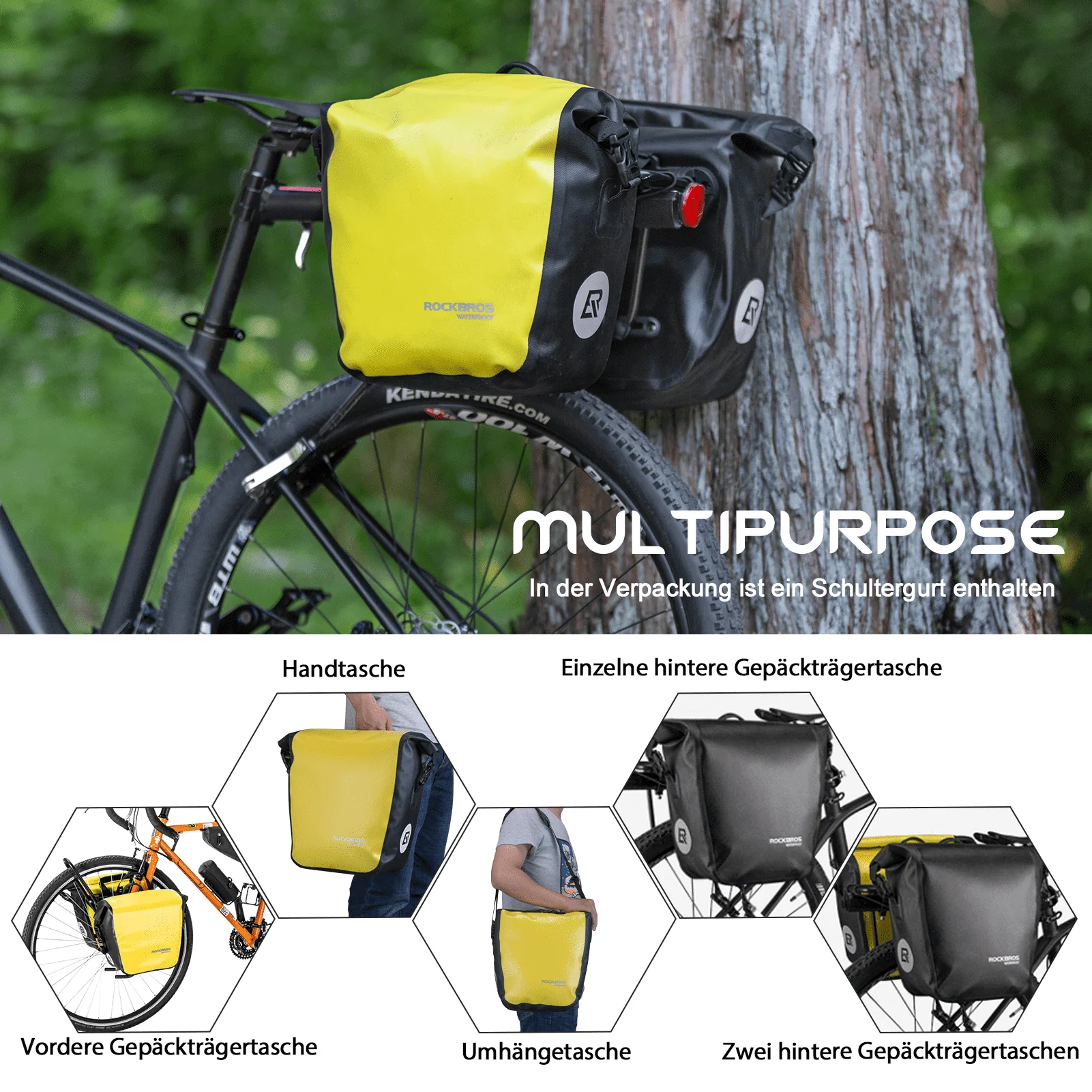 - TÖBBFUNKCIÓS: Ez a csomagtartó táska elöl és hátul is felszerelhető. A kerékpár első vagy hátsó kerekére is felszerelheti ezeket a táskákat. Tartalmazunk egy vállpántot is, így vállon hordható táskaként is használható.